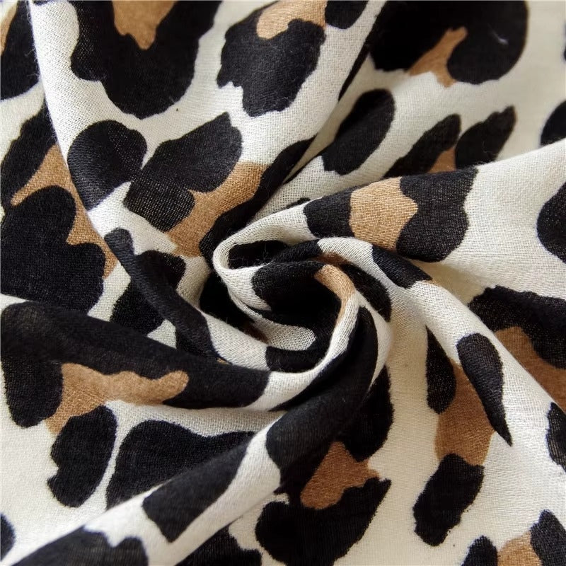 - Motif : Imprimé léopard noir et brun sur fond beige chaud,