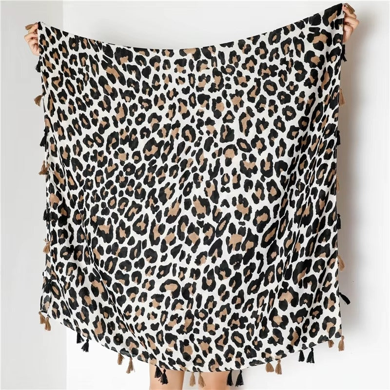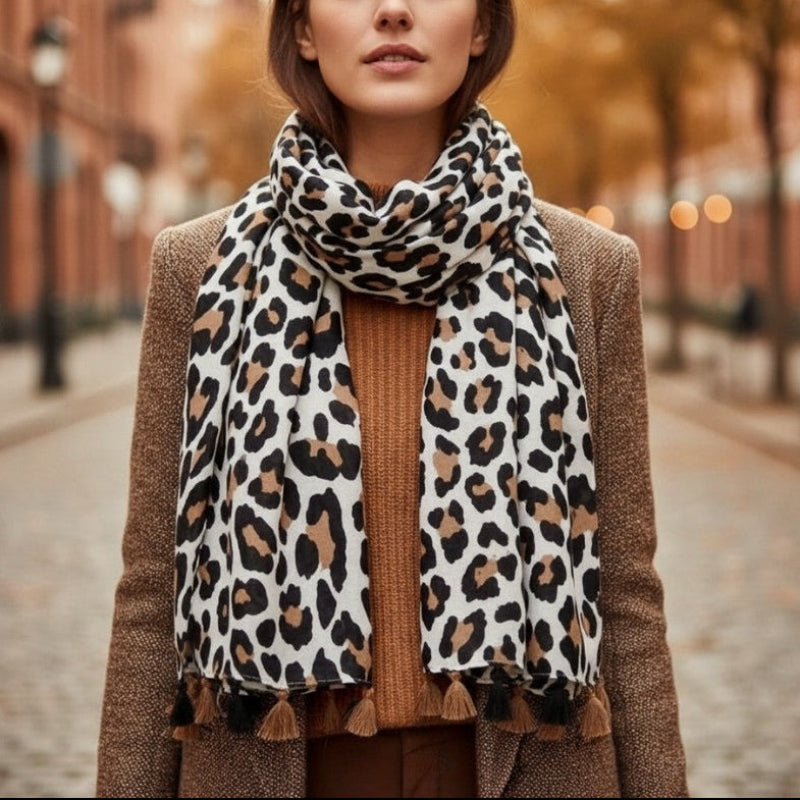 Confectionnée dans une matière douce au tombé souple, cette écharpe révèle un tissage fin et régulier qui capte la lumière avec discrétion. Le motif léopard, travaillé dans des nuances feutrées, s’intègre avec élégance à la trame légère. Les bords nets dessinent une ligne fluide, tandis que de petites franges aériennes ajoutent un mouvement subtil. Portée en étole ou drapée en tour de cou, elle épouse la silhouette sans contrainte. Le toucher soyeux réchauffe délicatement, comme une seconde peau posée entre soi et l’hiver.