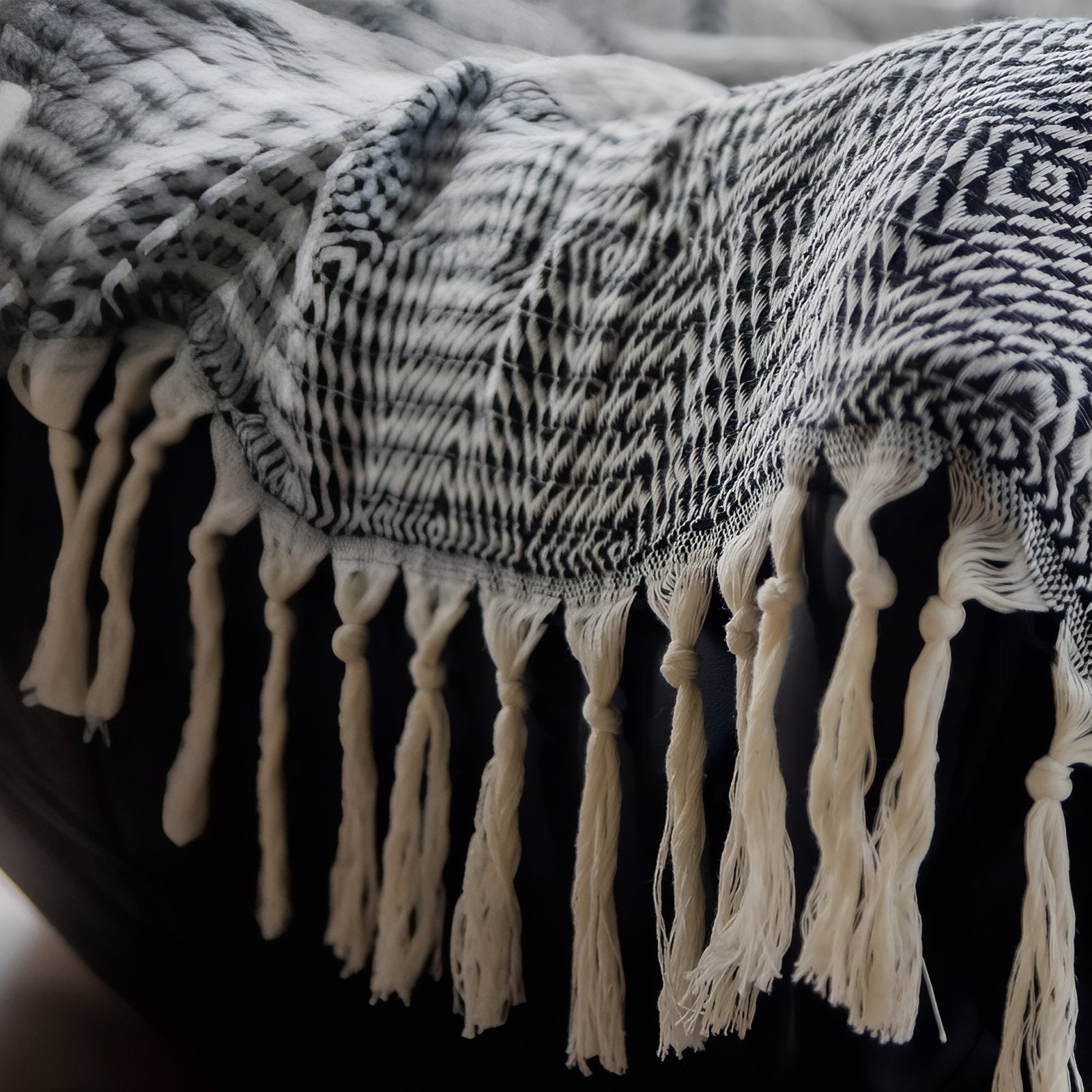- Finitions : Franges fines aux extrémités, esprit estival décontracté,