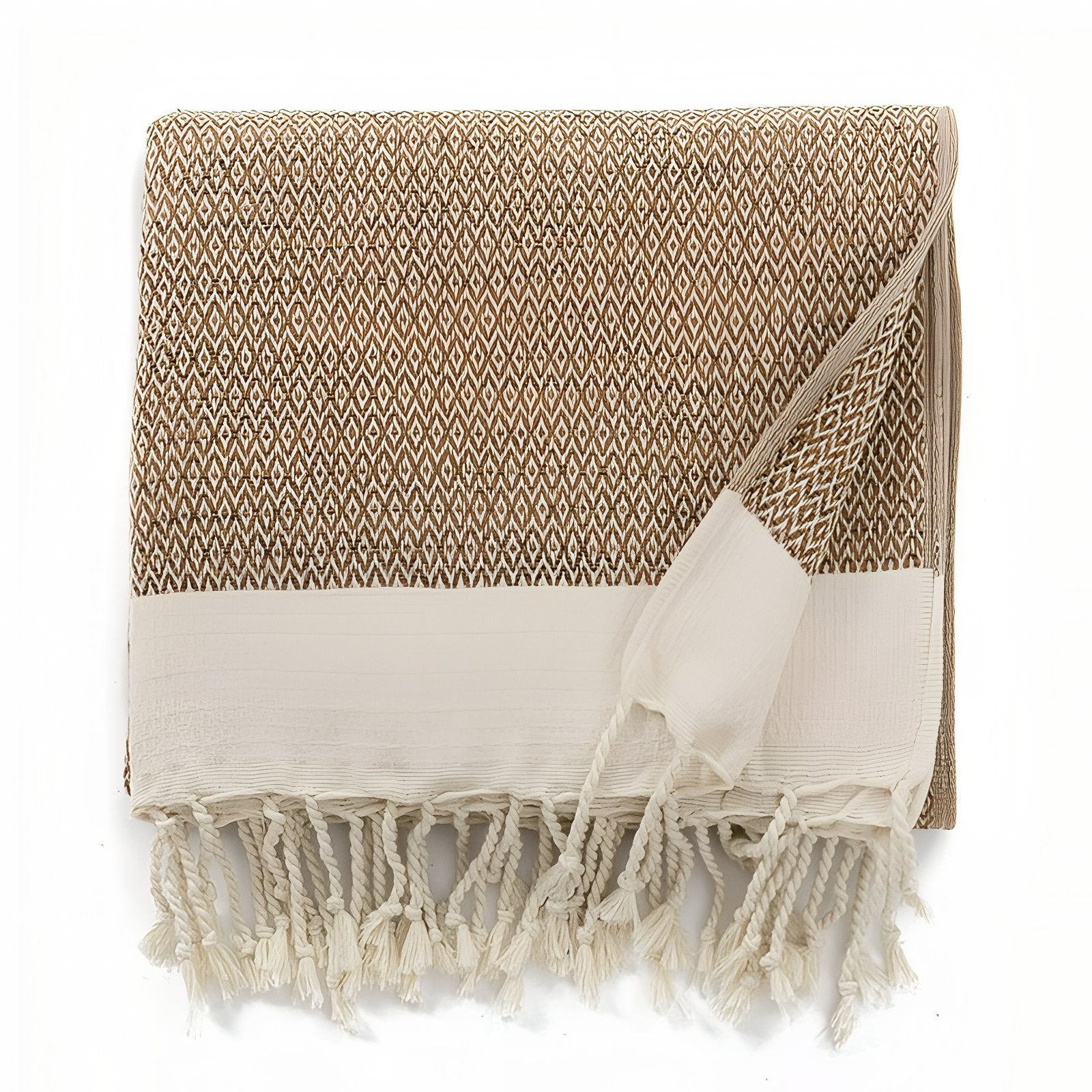 Conçue dans un tissu de qualité gaufré au relief subtil, cette fouta révèle un toucher aérien et une texture vivante qui évoque la chaleur douce des après-midis d’été. Ses finitions frangées aux extrémités apportent une touche de naturel, tandis que les bords nets et discrets soulignent la qualité de sa confection. Le motif léger, presque effacé, se fond dans une teinte sable apaisante, rappelant les grains tièdes d’un rivage. Souple et respirante, elle se prête à mille usages — drapée sur les épaules, nouée à la taille ou simplement étendue sur le sable chaud.